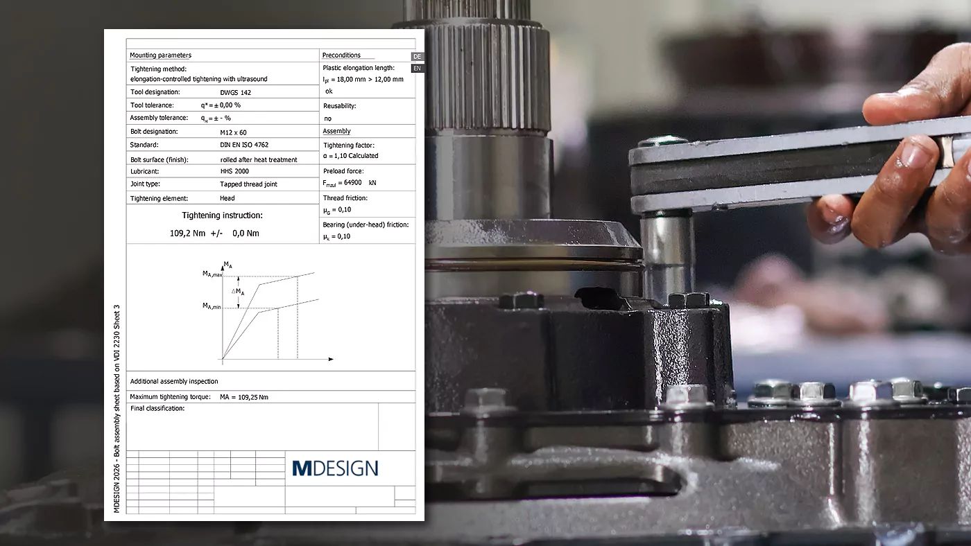 根据 VDI 2230 第3部分(草案)自动生成的包含计算值的装配单,汇总了所有重要参数,以实现安全、可追溯的装配过程。只需点击一下按钮,即可为您提供清晰、符合标准的螺栓连接文档。