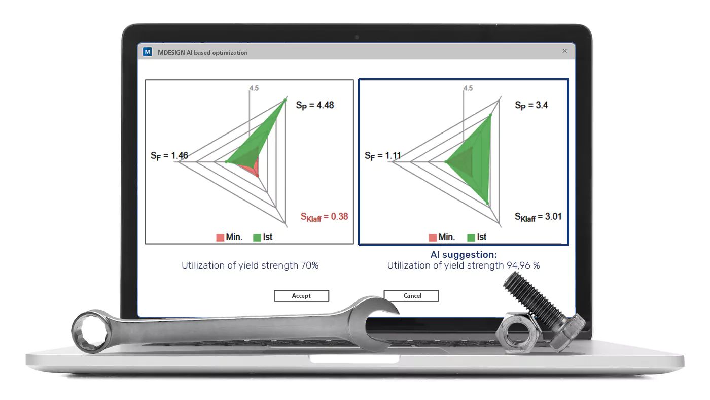 MDESIGN bolt 中的全新 AI 助手,可帮助您根据 VDI 2230 准则选择最佳的利用率。它能协助您判断自定义的规格何时适用——以及何时应采用不同的数值。这使得拧紧扭矩的设定更加可靠和高效。