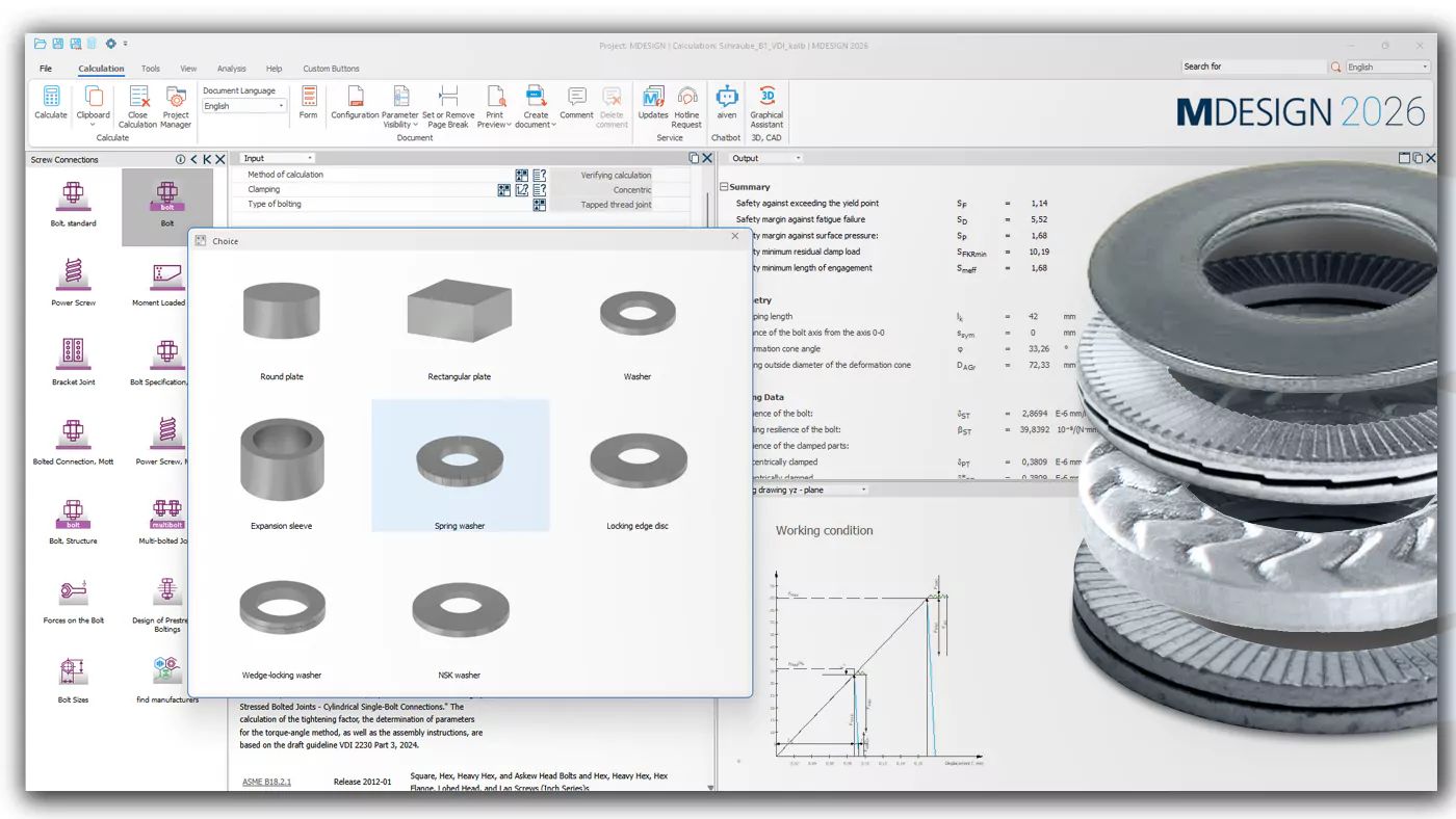 螺栓模块现已扩展数据库,新增多种防松元件,例如:弹簧垫圈、锁紧边缘垫圈、楔形锁紧垫圈和 NSK 垫圈等现已可用。此外,制造商数据也已更新并扩展,加入了 Teckentrup 和 Heico 的数据,使计算更加贴近实践且符合标准。